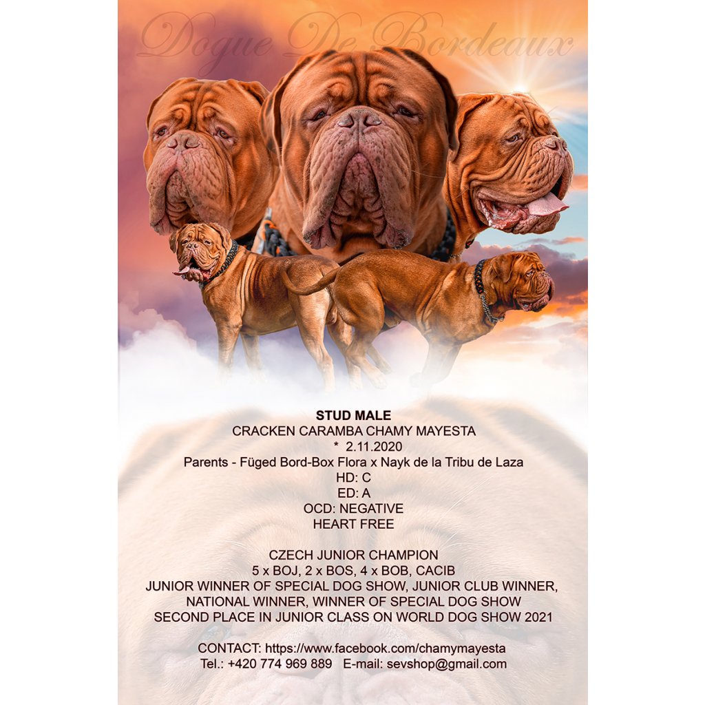 - Jméno samce, rasu, datum narození, zdravotní vyšetření, úspěchy na výstavách a soutěžích, jména rodičů, kontakt na majitele-jméno, telefonní číslo, adresu, webové stránky, logo chovatelské stanice.